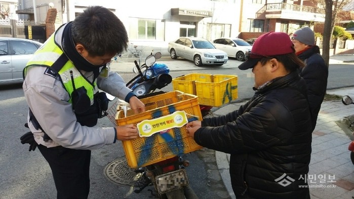 충남 아산경찰서 온양지구대 경찰관들은 교통사고다발지역을 방문해 이륜차 운전자를 상대로 야광반사지로 제작된 ‘안전거리 준수’ 홍보물 등을 부착하는 등 교통사고 예방을 위한 대민 홍보활동을 실시했다.(사진제공=아산경찰서)