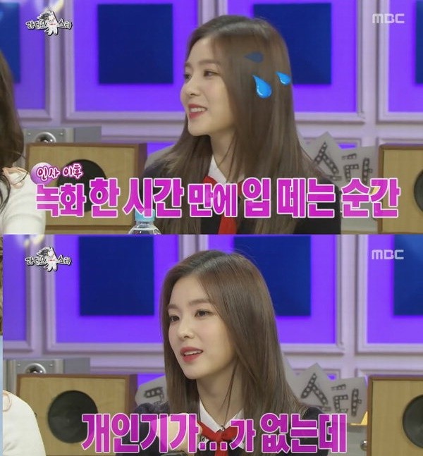 이날 방송에서 MC들은 아이린이 등장한지 한참만에 입을 열자 "한 시간만에 입 떼는 거다. 입을 떼는데 '뽁' 소리가 났다. 목소리 좀 듣고 싶다"고 부탁했다.