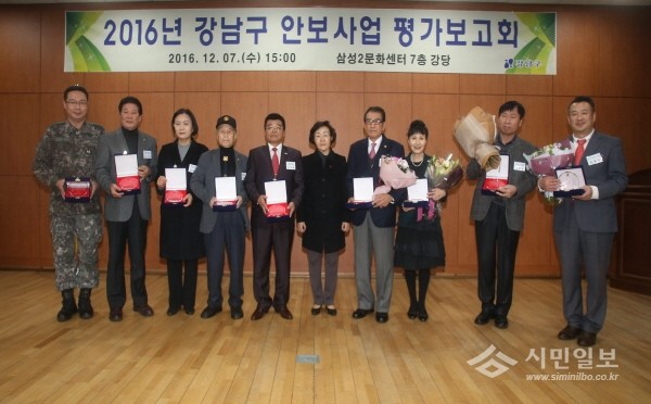 지난 7일 신연희 서울 강남구청장은 ‘2016 강남구 안보사업 평가 보고회’에 참석해 안보사업 유공자를 표창했다. 사진은 신 구청장(오른쪽에서 다섯번째)이 수상자와 기념촬영하는 모습.(사진제공=강남구청)