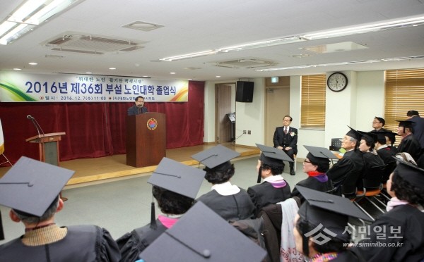 지난 7일 대한노인회 의정부시지회 부설 제36회 노인대학 졸업식이 열렸다. 사진은 시지회 관계자가 졸업생 총 56명(남 12명, 여 44명)에게 축사로 축하하는 모습.(사진제공=의정부시청)