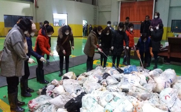 지난 6일 경기 수원시 팔달구는 수원시 자원회수시설에 반입되는 '쓰레기 샘플링 체험'을 단체원 및 주민 40여명이 참여한 가운데 실시했다. 사진은 참여자들이 무단투기봉투에 담긴 쓰레기 비율을 눈으로 직접 확인하는 모습.(사진제공=팔달구청)
