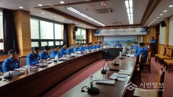 최근 전남 완도군은 군청 상황실에서 관련 실·과·소장, 부문별 업무담당 등 30여명이 참석한 가운데 ‘기후변화 적응대책 추진사항 제4차 보고회’를 개최했다. 사진은 신우철 군수(가운데)와 관계자들이 회의를 하고 있는 모습.(사진제공=완도군청)