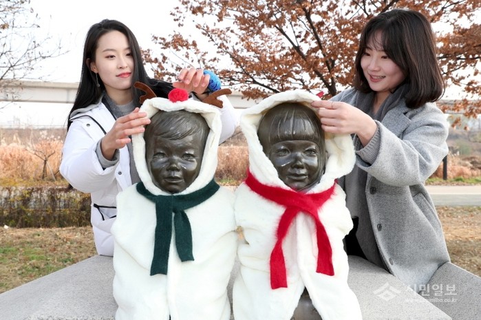 지난 7일 성동구 살곶이공원의 남매상 '여울이'와 '가람이'가 겨울을 맞아 따뜻한 털옷으로 갈아입었다. 사진은 남매상 의상을 제작하고 있는 한양여대 패션디자인학과 동아리 ‘패크레’ 학생들이 겨울옷을 남매상에 입히는 모습.(사진제공=성동구청)