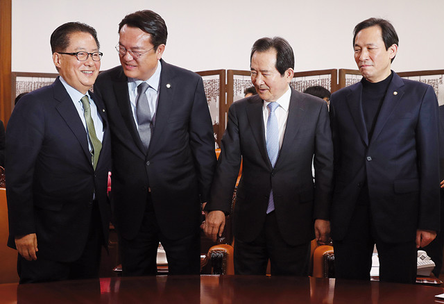 박근혜 대통령 탄핵표결을 하루 앞둔 8일 오전 국회 본청 의장실에서 여야 원내대표가 현안을 논의하기에 앞서 손을 맞잡고 있다. 왼쪽부터 국민의당 박지원 원내대표, 새누리당 정진석 원내대표, 정세균 국회의장, 더불어민주당 우상호 원내대표.