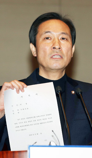 더불어민주당 우상호 원내대표가 8일 오전 국회에서 열린 비상 의원총회에서 탄핵 부결시 소속 국회의원 전원의 의원직 총사퇴 방침을 밝히며 사직서를 들어보이고 있다.