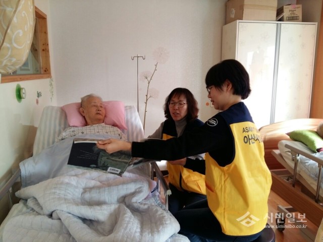 최근 충남 아산시립도서관 ‘책봉우리 봉사단’은 음봉면 신수리에 있는 가나안복지원을 찾아 노인들에게 그림책을 읽어주는 봉사활동을 실시했다. 사진은 봉사단원들이 거동이 불편한 노인에게 책을 보여주고 있는 모습.(사진제공=아산시청)