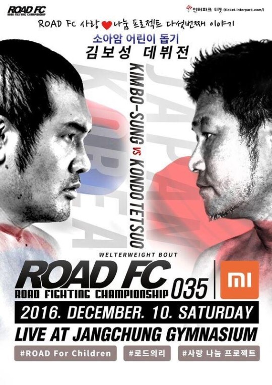 또 김보성은 경기에 앞서 "이 한 몸을 바치면 우리 소아암 어린이들을 한 명이라도 더 살릴 수 있다는 생각에 종합격투기 데뷔를 결심하게 됐다"며 "로드FC 정문홍 대표님도 저의 진심을 이해해주시면서 입장 수익 전액을 소아암 어린이들에게 기부하기로 결정해주셨다"고 얘기했다.