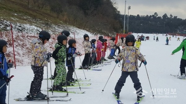 지난 8~9일 경기 양평군과 한국자유총연맹 양평군지회는 홍천 대명비발디파크에서 다문화가족 자녀 33명을 대상으로 '1박2일 아리랑 스키캠프'를 개최했다. 사진은 지난 8일에 어린이들이 스키를 타는 모습.(사진제공=양평군청)