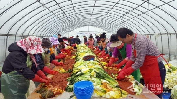 지난 8일 전남 장흥군 장흥읍은 새마을부녀회, 이장자치회, 번영회 주관으로 덕제마을에서 '2016 사랑담은 착한김치 나눔' 행사를 개최했다. 사진은 행사 참가자들이 김치를 담그는 모습.(사진제공=장흥군청)