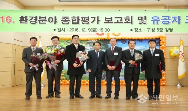 최근 서울 구로구가 구청 강당에서 열린 ‘2016년 환경분야 종합평가 보고회’에 참석한 이성 구청장(가운데)이 환경 정책에 기여한 개인, 단체, 기업체 등에 표창장을 수여하고 함께 기념촬영하고 있다.(사진제공=강동구청)