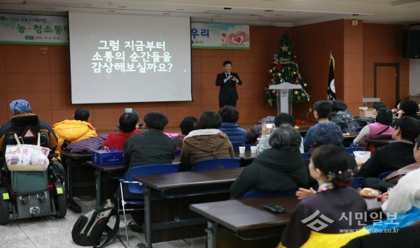 최근 서울 강동구는 구청 대강당에서 농인과 청인 50여명이 참여한 가운데 '농청 소통행사-수화로 톡하는 우리'를 개최했다. 사진은 무대에서 사회자가 프로그램을 진행하는 모습.(사진제공=강동구청)