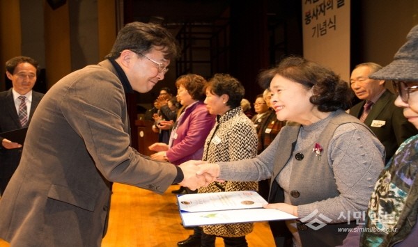 최근 서울 은평구는 은평문화예술회관 공연장에서 자원봉사자, 복지관 관계자, 주민 등 500여명이 참석한 가운데 ‘2016 은평구 자원봉사자의 날 기념식’을 개최했다. 사진은 김우영 구청장(왼쪽)이 우수봉사자에게 표창하고 악수하는 모습.(사진제공=은평구청)