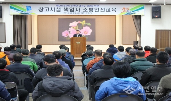 지난 9일 경기 이천소방서는 대회실에서 5000㎡ 이상 창고시설 책임자 60명을 대상으로 '소방안전교육'을 실시했다. 사진은 이경우 서장이 교육을 진행하는 모습.(사진제공=이천소방서)