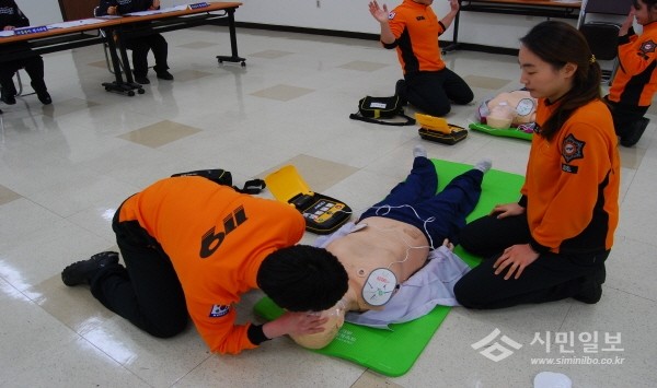 경기 동두천소방서는 12일 대회의실에서 현장활동 소방공무원 73명을 대상으로 ‘2016년 하반기 소방전술훈련 평가’를 실시했다. 사진은 소방관이 심폐소생술 실기평가를 진행하는 모습.(사진제공=동두천소방서)