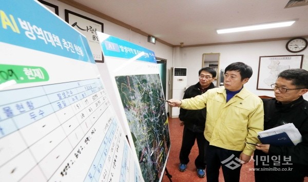 최근 정찬민 경기 용인시장은 조류 인플루엔자(AI) 의심 신고가 접수된 양계농가의 관할 백암면사무소를 긴급 방문해 인근 지역으로 확산되지 않도록 담당자들에게 철저한 방역을 지시했다. 사진은 정 시장(가운데)이 현황도를 살펴보는 모습.(사진제공=용인시청)