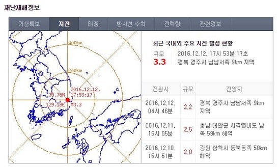 기상청은 오늘(12일) 오후 5시 53분 경상북도 경주시 남 남서쪽 9킬로미터 지역에서 규모 3.3의 지진이 일어났다고 밝혔다.
