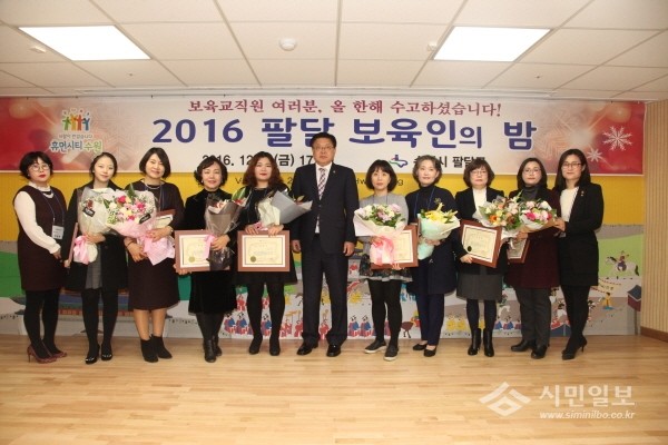 최근 경기 수원시 팔달구는 지역내 어린이집 보육교직원 100여명과 함께 '2016 팔달 보육인의 밤' 행사를 개최했다. 사진은 배민한 구청장(가운데)과 참여자들이 기념촬영하는 모습.(사진제공=팔달구청)