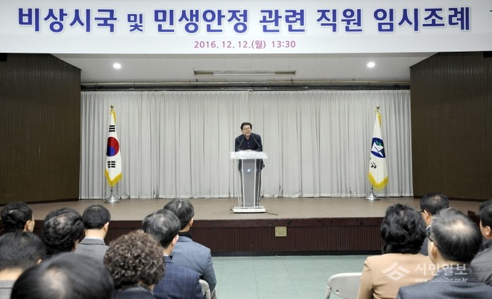광진구는 지난 12일 오후 1시30분 구청 대강당에서 전직원을 대상으로 '비상시국 및 민생안정관련 직원 임시조례'를 실시했다. 사진은 김기동 구청장이 발언하는 모습.(사진제공=광진구청)