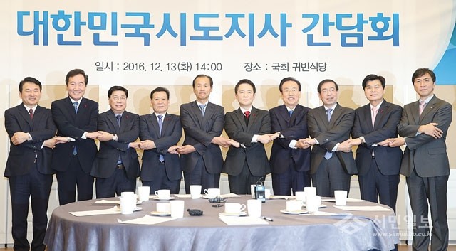 13일 오후 국회 귀빈식당에서 열린 긴급 시도지사 간담회에서 원희룡 제주도지사(왼쪽부터), 이낙연 전남도지사, 권선택 대전시장, 윤장현 광주시장, 최문순 강원도지사, 남경필 경기도지사, 김관용 경북도지사, 박원순 서울시장, 이춘희 세종시장, 안희정 충남도지사가 기념촬영을 위해 포즈를 취하고 있다.