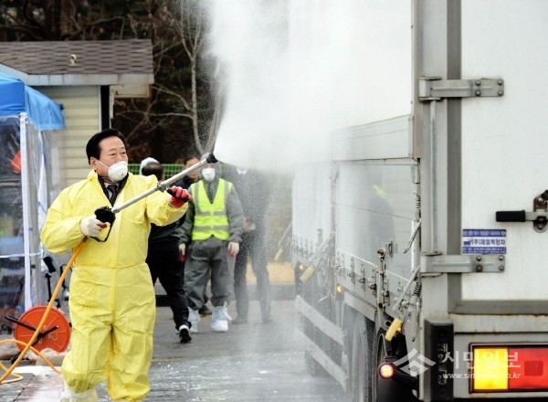 지난 12일 조억동 경기 광주시장은 곤지암도자공원 일대 3번국도변에 설치된 고병원성 조류인플루엔자(AI) 거점 소독시설을 방문해 방역상황을 점검한 후 소독활동에 참여했다. 사진은 조 시장이 차량을 소독하고 있는 모습.(사진제공=광주시청)