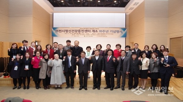 최근 경기 이천시 정신건강증진센터에서는 성안드레아병원에서 건강증진센터 개원 10주년 기념행사를 개최했다. 사진은 행사에 참여한 조병돈 시장(가운데) 및 참여자들이 기념촬영하는 모습.(사진제공=이천시청)