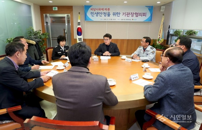 지난 12일 성동구는 구청 7층 전략회의실에서 대통령 탄핵안 가결에 따른 민생안정을 위한 기관장협의회를 개최했다. 사진은 정원오 구청장(가운데)과 관계자들이 회의를 진행하고 있는 모습.(사진제공=성동구청)