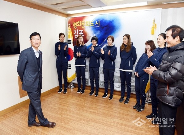 지난 13일 유영록 경기 김포시장은 부산으로 동계 전지훈련을 떠나는 시청 육상팀 선수들을 시청으로 초대해 격려했다. 사진은 유 시장(왼쪽)이 시청 육상팀 선수들에게 격려의 말을 전하고 있는 모습.(사진제공=김포시청)