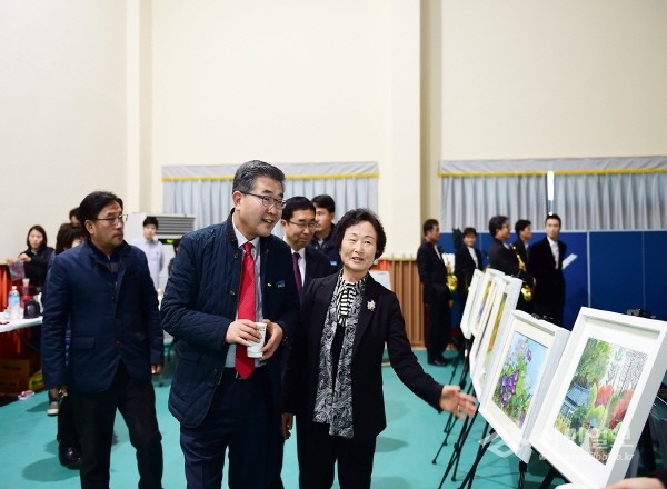 최근 경기 여주시 산북체육관에서 산북면 주민자치위원회가 주최하고 산북면사무소가 후원한 ‘2016 한마음 음악회’가 열렸다. 사진은 원경희 시장(가운데)이 부대행사로 마련된 수채화 전시회를 둘러보는 모습.(사진제공=여주시청)