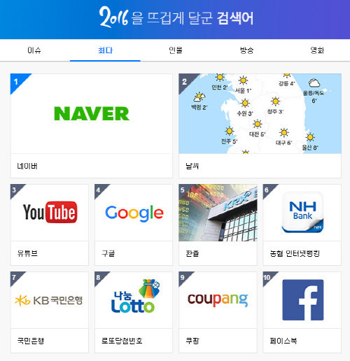 다음이 공개한 '2016을 뜨겁게 달군 검색어' 최다 부문에서 '네이버'가 1순위를 차지했다. 다음 이용자가 '네이버'를 가장 많이 검색했다는 소리다. '날씨' '유튜브' '구글' '환율' 등이 그 뒤를 이었다.