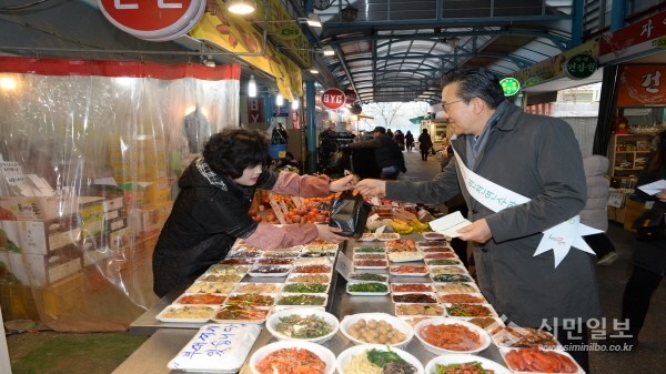 지난 14일 인천 연수구 연수2동 복지위원회는 옥련재래시장에서 지역상권 활성화운동의 일환으로 '따뜻한 렛츠런 인천연수와 함께 장바구니 들고 재래시장으로 gogo' 행사를 실시했다. 사진은 이재호 구청장이 시장 상인으로부터 음식을 구매하는 모습.(사진제공=연수구청)