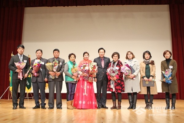 지난 12일 서울 강동구의회 조동탁 의장은 구민회관에서 열린 ‘새마을지도자대회’에 참석해 봉사 유공자들을 표창했다. 사진은 조 의장(오른쪽 다섯번째)과 봉사 유공자들이 기념촬영하는 모습.(사진제공=강동구의회)