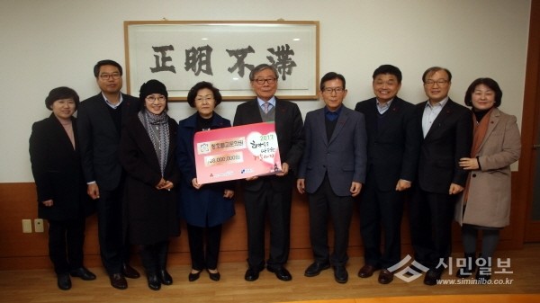 지난 14일 신연희 서울 강남구청장(왼쪽에서 네 번째)이 청호불교문화원으로부터 희망온돌 따뜻한 겨울나기 후원금 1억800만원을 전달받고 관계자들과 함께 기념촬영을 하고 있다.(사진제공=강남구청)