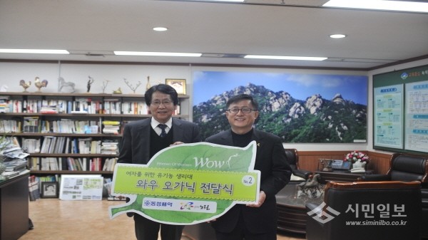 지난 14일 서울 노원구는 구청장실에서 동성제약으로부터 저소득 여성청소년을 위한 유기농 생리대 1500팩(1200만원 상당)을 기증받는 '여성용품 전달식'을 개최했다. 사진은 김성환 구청장(오른쪽)과 관계자가 기념촬영하는 모습.(사진제공=노원구청)