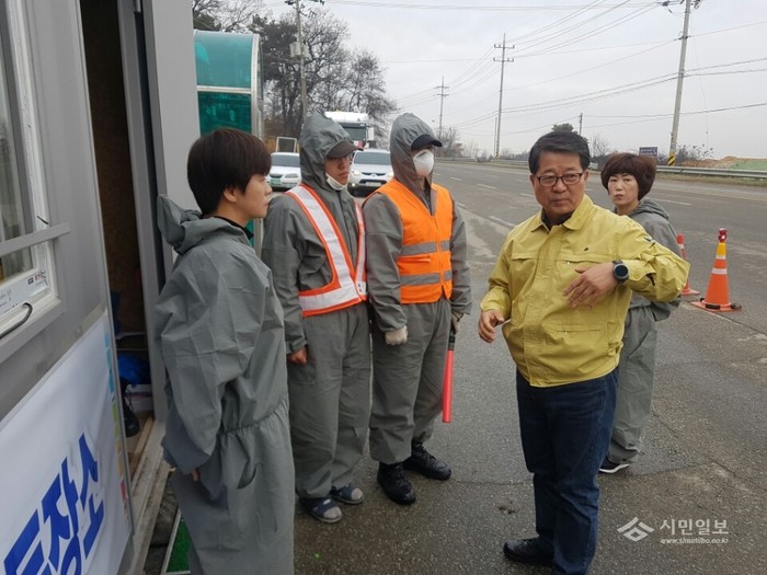 지난 13일 조병돈 경기 이천시장은 설성면 통제초소 등 6곳을 방문해 근무자들을 격려하면서 소독시설의 이상 유무를 점검했다. 사진은 조 시장(오른쪽)이 방역 담당자들과 이야기를 나누고 있는 모습.(사진제공=이천시청)