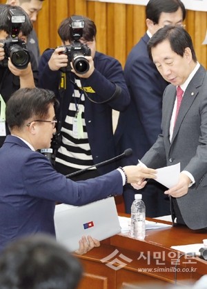 조한규 전 세계일보 사장(왼쪽)이 15일 오후 서울 여의도 국회에서 열린 ‘박근혜 정부의 최순실 등 민간인에 의한 국정농단 의혹사건 진실규명을 위한 국정조사특위 제4차 청문회’에 참석해 김성태 위원장에게 양승태 대법원장 사찰문건을 증거자료로 제출하고 있다.