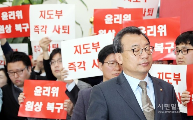 새누리당 이정현 대표가 15일 오전 국회 대표실에서 지도부 사퇴와 윤리위 원상복구를 촉구하며 시위를 벌이고 있는 사무처 직원들에게 입장을 밝힌 뒤 발걸음을 돌리고 있다.