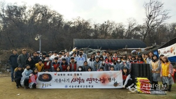 최근 서울 강동구 서울컨벤션고등학교 봉사단체 '샤프론&프론티어' 학생·학부모 등 80여명이 고덕2동 비닐하우스촌에 거주 중인 홀몸노인 5가구를 대상으로 쌀과 연탄을 배달하는 '사랑의 연탄나눔' 행사를 실시했다. (사진제공=서울컨벤션고등학교)