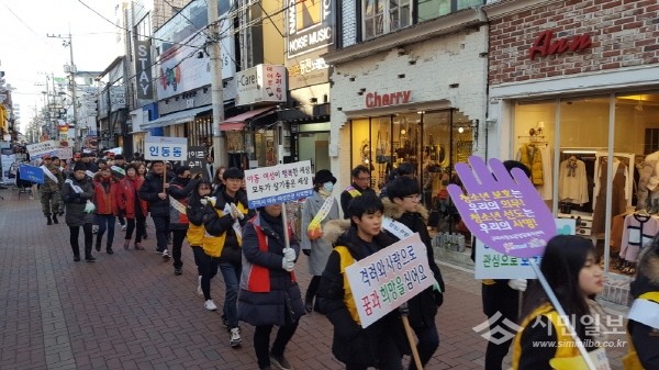 최근 경북 구미시는 원평동 공영주차장에서 유관기관 직원 및 청소년 등 300여명이 참석한 가운데 연말연시 청소년 선도 결의대회 및 가두캠페인을 전개했다. 사진은 캠페인 참가자들이 가두행진을 벌이는 모습.(사진제공=구미시청)