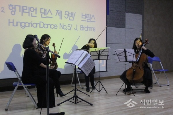 경기 부천시에 위치한 소사고등학교는 최근 1·2학년 학생을 대상으로 부천팝스오케스트라의 현악 4중주 연주자들을 초청해 행복한 학교문화 조성과 힐링을 위한 '공감 음악회'를 개최했다. 사진은 오케스트라 단원들이 연주하는 모습.(사진제공=소사고등학교)