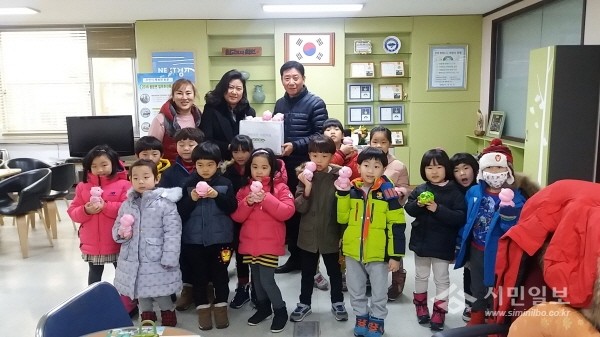 최근 경기 양평군 용문면에 위치한 사랑나무어린이집·아이꿈터어린이집 원생들과 교사가 용문면사무소를 방문해 어려운 이웃돕기를 위한 성금 50만원을 전달했다. 사진은 관계자들이 기념촬영하는 모습.(사진제공=양평군청)