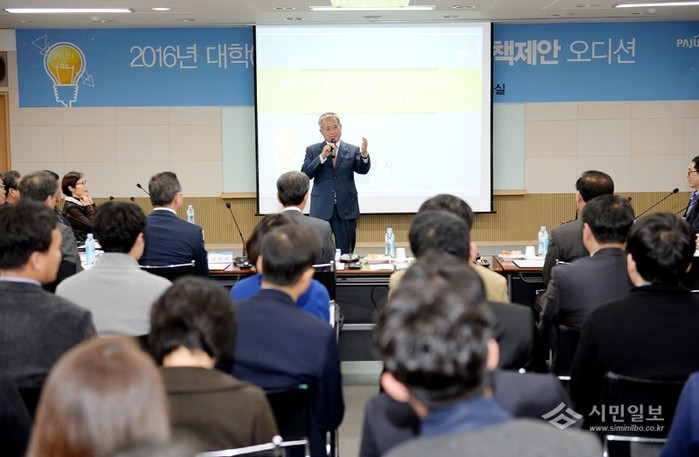 | ▲ 지난 11월14일 이재홍 파주시장이 시청 대회의실에서 열린 '2016년 대학(원)생 파주시장 정책제안 오디션' 참가자들에게 인사말을 전하고 있다. | ||