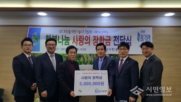 최근 서울 은평구 신사1동은 동주민센터 3층에서 기업은행·서부21 회원들이 십시일반으로 모은 행복나눔 사랑의 장학금 500만원을 기탁받는 전달식 행사를 열었다. 사진은 관계자들이 기념촬영하고 있는 모습.(사진제공=은평구청)