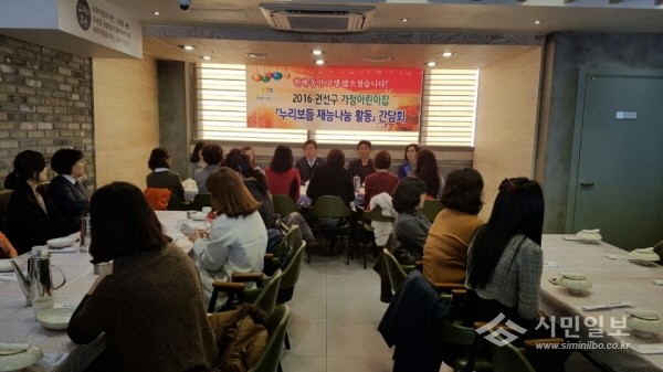 권선구, 「누리보듬 재능나눔」 간담회지난 20일 경기 수원시 권선구에서는 구 가정어린이집연합회에서 실시하는 '누리보듬 재능나눔' 활동에 참여한 어린이집 원장 등 24명이 참석한 가운데 간담회를 실시했다. 사진은 참여자들이 회의하는 모습.(사진제공=권선구청)