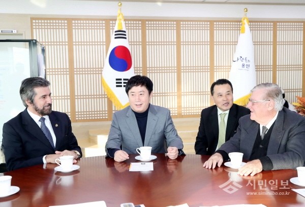 정찬민 경기 용인시장(왼쪽에서 두 번째)이 21일 시장실에서 브라질 국립 아마존연구소(INPA)의 한국지사 설립을 추진하기 위해 방한한 바우질 하우삐(Valdir Raupp) 상원의원(맨 왼쪽)과 아밀 란도(Amir Francisco Lando) 전 상·하원의원을 접견했다.(사진제공=용인시청)