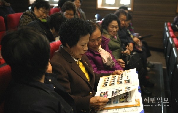 지난 20일 전남 강진군은 농업기술센터 대강당에서 '찾아가는 여성농민 한글학교'의 제8회 졸업식을 개최했다. 사진은 졸업식에 참석한 노인들이 졸업 앨범을 들여다보고 있는 모습.(사진제공=강진군청)