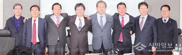 새누리당 김무성 전 대표와 유승민 의원 등 비주류 의원들이 21일 오전 서울 여의도 국회 의원회관에서 열린 회동이 끝난 뒤 기자회견을 마치고 포즈를 취하고 있다. 왼쪽부터 김학용, 이군현, 김성태, 유승민, 김무성, 황영철, 권성동, 정운천.