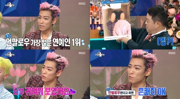 이날 MC들은 탑에게 "SNS 언팔로우가 가장 많은 연예인 1위다"고 말하자 쿨하게 인정하는 모습을 그려냈다.