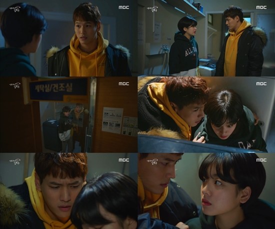 이때 밖에서 인기척이 났고, 태권은 선옥의 팔을 확 끌어당겨 세탁기들 사이 속 좁은 공간에 같이 숨게 되었다. 이내 가까워진 두 사람은 민망한 듯 쑥스러운 표정을 지어 보여 묘한 핑크빛 기류를 풍겼다.