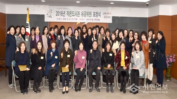 지난 21일 서울 노원구는 구청 기획상황실에서 작은도서관 유공위원 표창식을 개최하고 21명의 위원들을 표창했다. 사진은 김성환 구청장(앞줄 오른쪽에서 네번째)과 관계자들이 기념촬영하는 모습.(사진제공=노원구청)