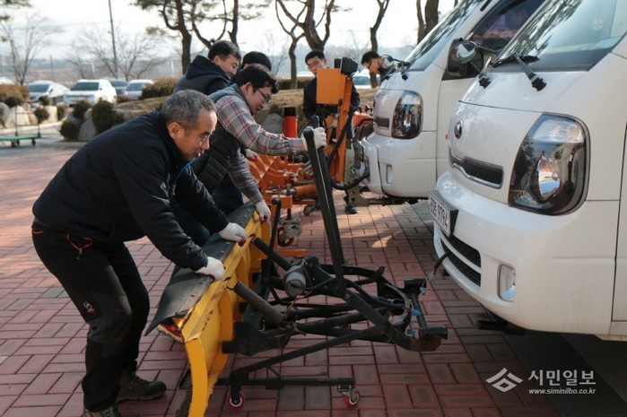 지난 20일 경기 양주시시설관리공단은 문화예술회관에서 공단 임직원과 함께 ‘폭설대비 제설훈련’을 실시했다. 사진은 직원들이 트럭에 제설장비를 설치하는 훈련을 하는 모습.(사진제공=양주시시설관리공단)